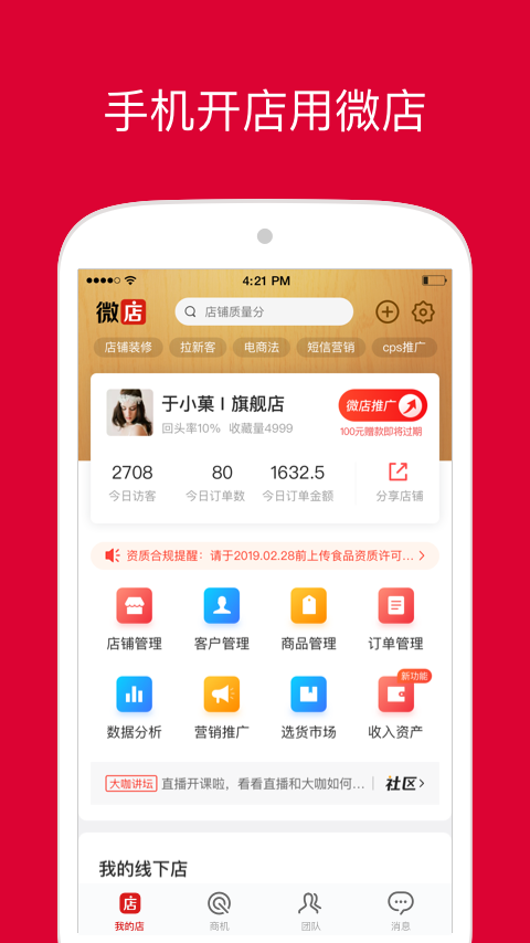 相比传统的电商平台,微店门槛低,注册简单,几乎人人都可以轻松上手。你只需要一部手机,就可以开启你的微店之旅。